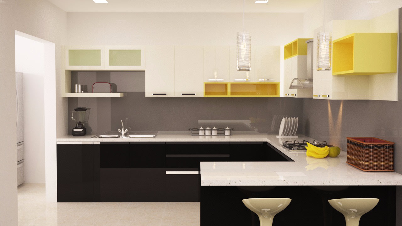 3D G shaped modular kitchen with hint of lemon yellow by ...